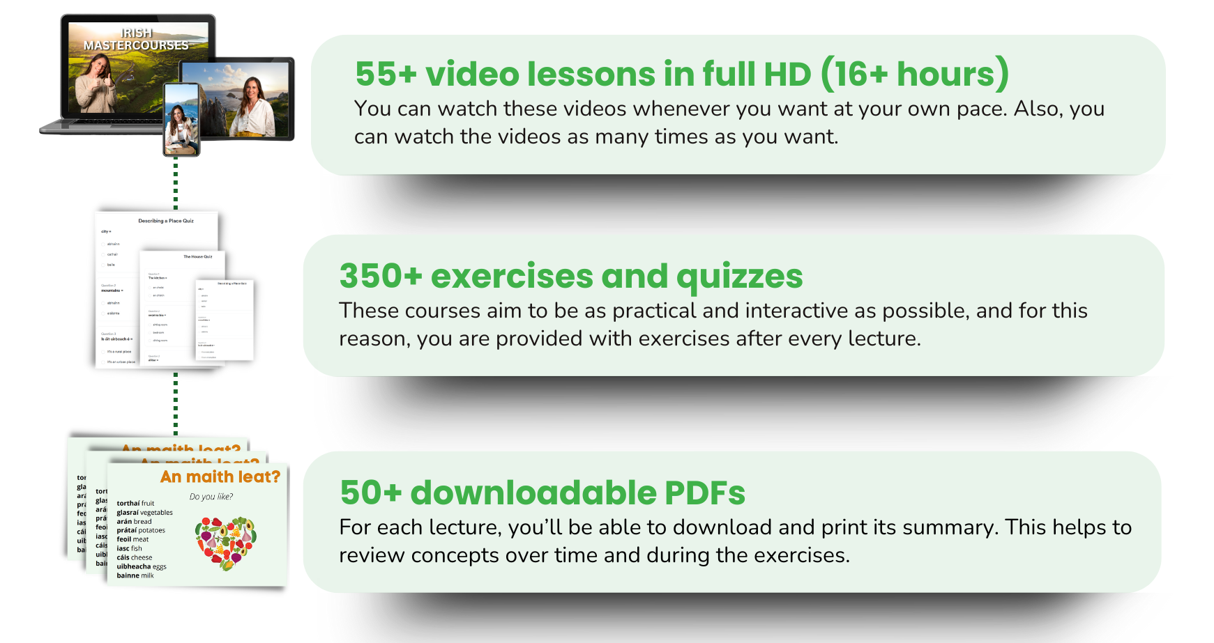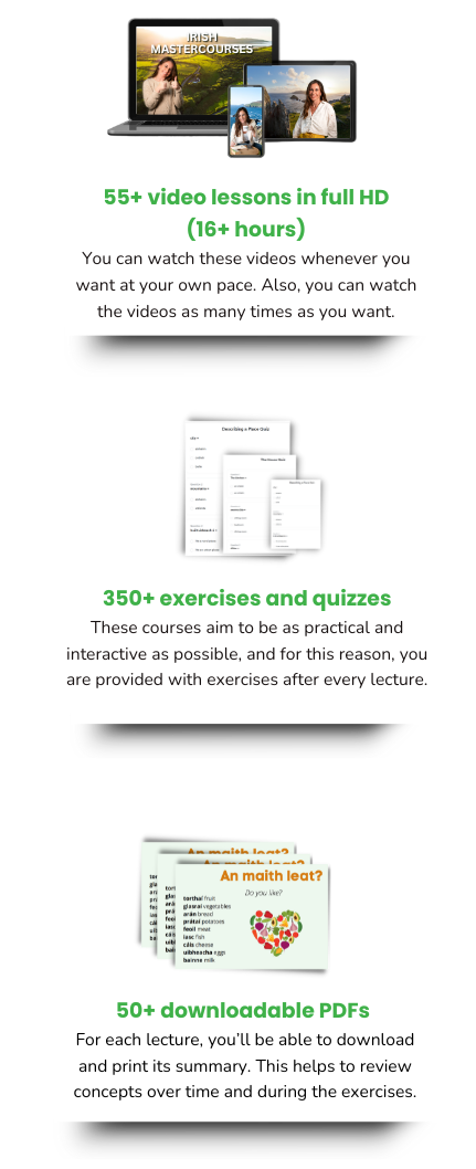With 50+ video lessons, weekly live classes, personal support and a community of 10,000+ Irish learners always by your side!
