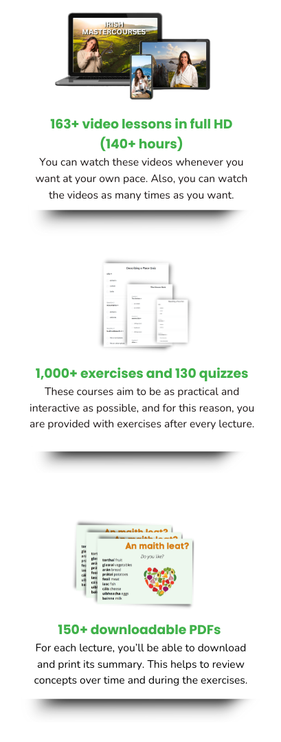 I believe that my online Irish courses are highly effective because you can follow the lessons when it’s most convenient for you and you can review the concepts as many times as you want. In other words, you learn at your own pace with no pressure, and without the need of attending a class.