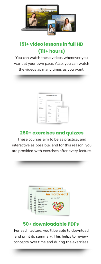 I believe that my online Irish courses are highly effective because you can follow the lessons when it’s most convenient for you and you can review the concepts as many times as you want. In other words, you learn at your own pace with no pressure, and without the need of attending a class.