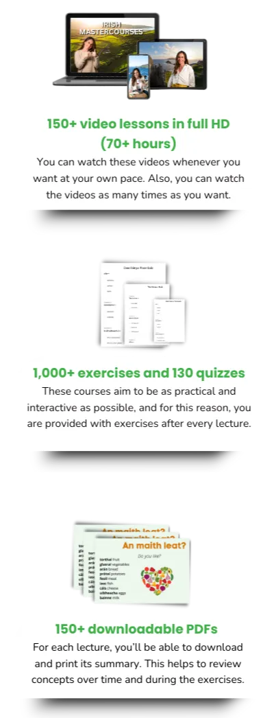 I believe that my online Irish courses are highly effective because you can follow the lessons when it’s most convenient for you and you can review the concepts as many times as you want. In other words, you learn at your own pace with no pressure, and without the need of attending a class.